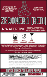 ZeroNero [red] captures the essence of a classic Italian aperitivo with a modern twist with a blend of baking spices, elderberries, rose, peppercorns, agave nectar, hibiscus, mint, orange, and bitter roots and herbs.